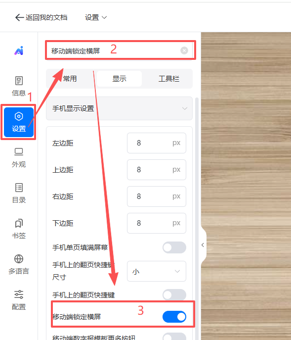 當(dāng)上傳橫版的電子書(shū)時(shí),手機(jī)端豎屏查看效果不佳。您可以設(shè)置移動(dòng)端鎖定橫屏功能,無(wú)需手動(dòng)調(diào)整,手機(jī)打開(kāi)電子書(shū)時(shí)屏幕將自動(dòng)切換為橫屏模式查看。