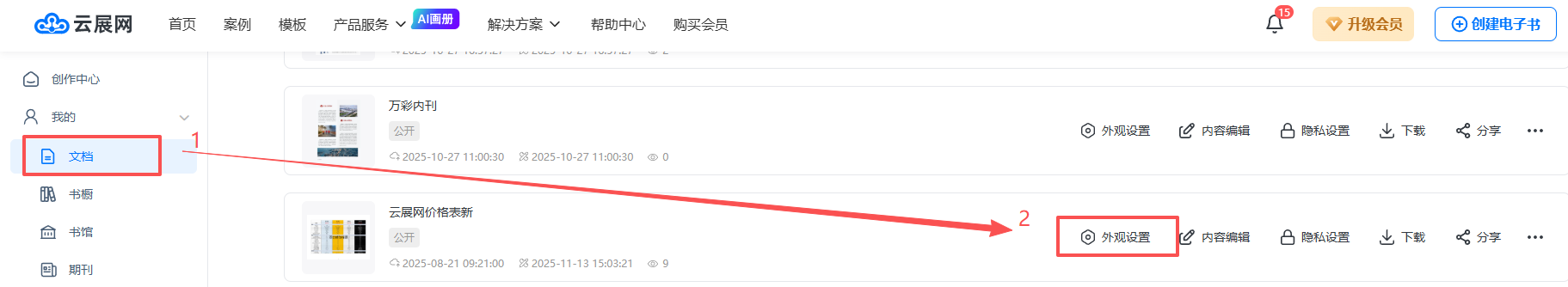 在【文檔】頁(yè)面,找到需要設(shè)置的書(shū)籍,點(diǎn)擊【外觀設(shè)置】進(jìn)入。