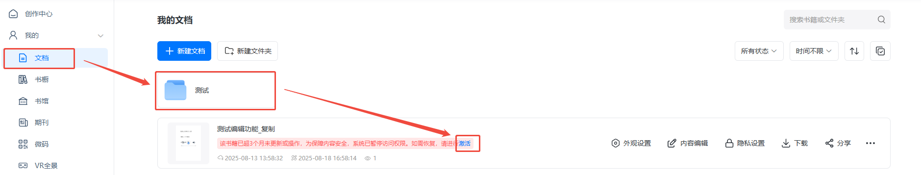 為進一步保障內(nèi)容安全,免費用戶的書籍若連續(xù)三個月內(nèi)無任何編輯、修改等更新操作,或者付費會員會員資格到期滿三個月起,系統(tǒng)將對書籍進行暫時停止訪問處理,用戶登錄賬戶并完成激活操作后,可立即恢復書籍的正常訪問權限。