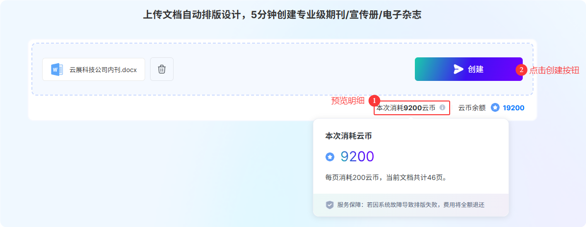 2.? 文檔上傳成功后,,用戶瀏覽確認計費明細,點擊【創(chuàng)建】按鈕,即扣除云幣,此操作不可撤銷。