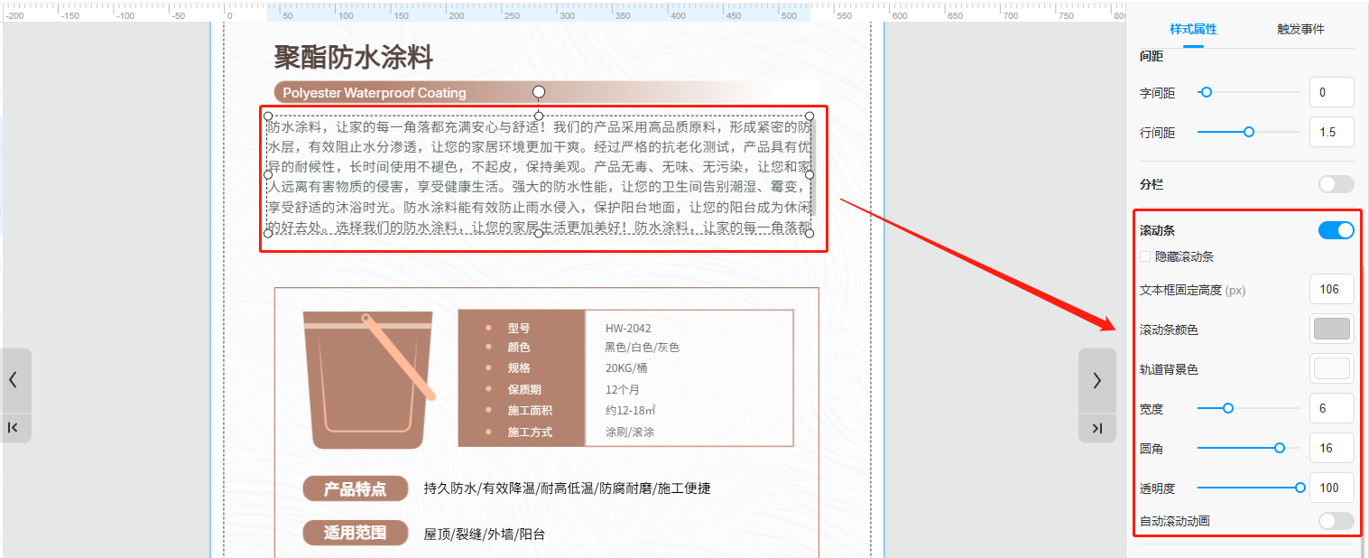 當(dāng)文字段落太長,又不想它占據(jù)頁面太多面積時(shí),可以選中文本框并打開【滾動條】,這樣可以縮小文本框的面積,讀者可以滑動觀看后面的內(nèi)容。