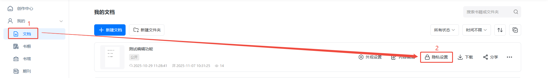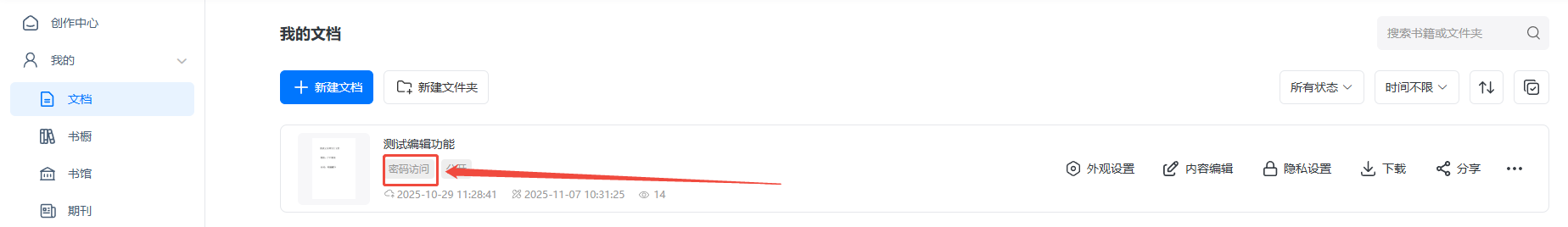 點擊【文檔】需要添加閱讀密碼的電子書,點擊【隱私設(shè)置】,勾選【添加閱讀密碼】