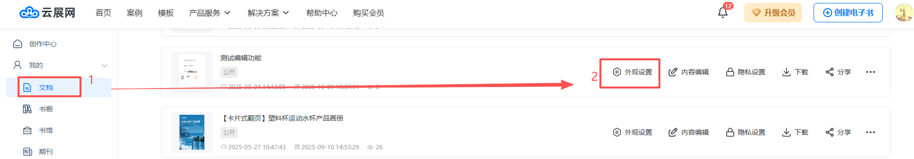 1、在【文檔】頁面,點擊【外觀設(shè)置】打開書籍編輯器。