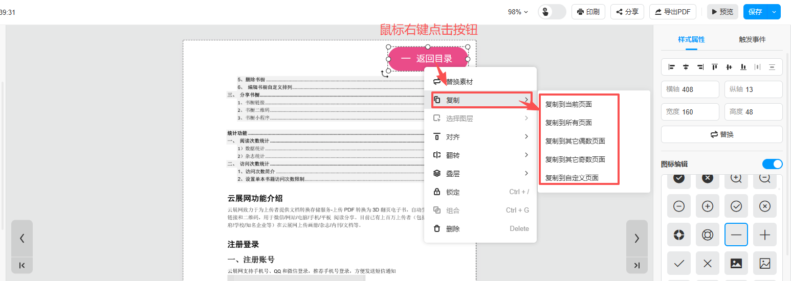 4、右鍵點擊返回目錄按鈕,將其復(fù)制到除了封面封底以及目錄頁以外的其他頁面,因為復(fù)制的按鈕位置是統(tǒng)一的,所以排版的時候需要在每一頁給按鈕留個位置。