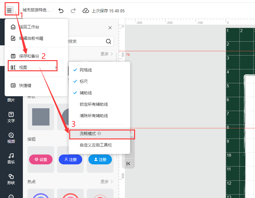 點擊左上角的【三橫杠圖標】,點擊【視圖】,勾選【流暢模式】