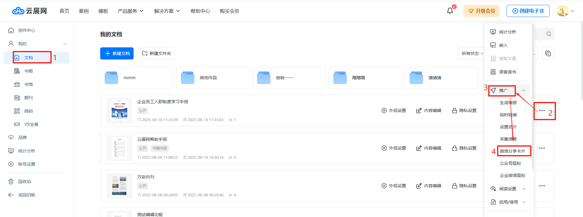 在【文檔】頁面右側(cè),點擊“…”三個點按鈕,點擊【推廣】,隨后點擊【微信分享卡片】