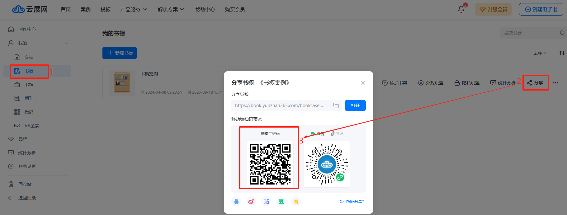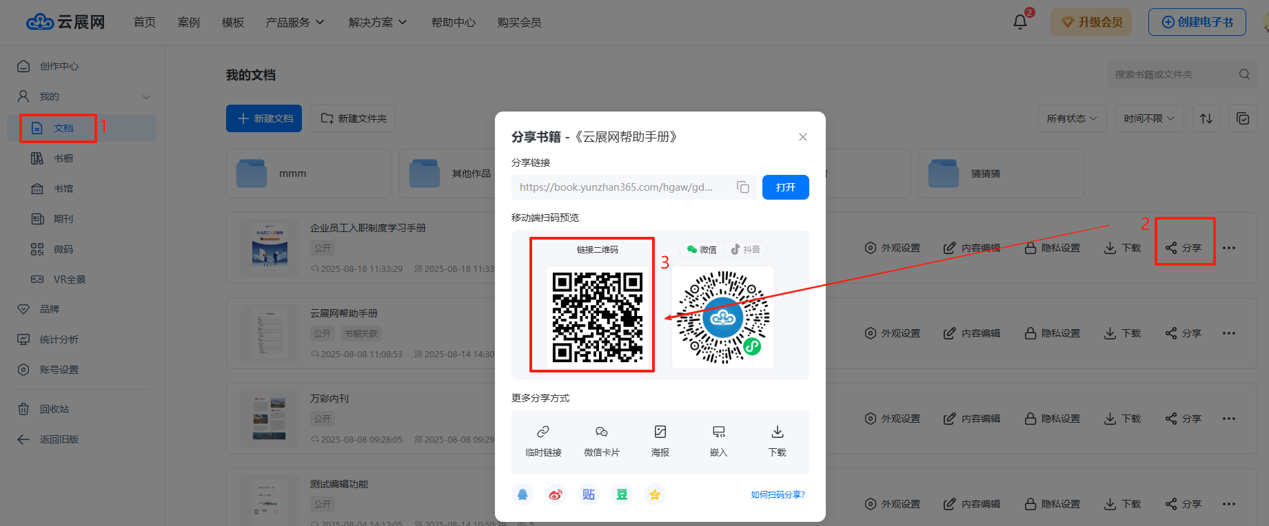 在【文檔】/【書櫥】頁面,點擊【分享】,獲取書籍鏈接二維碼/書櫥二維碼