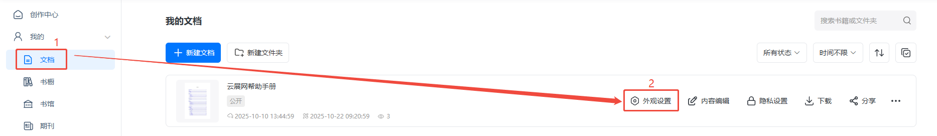 在【文檔】找到需要設置的電子書,點擊【外觀設置】進入。