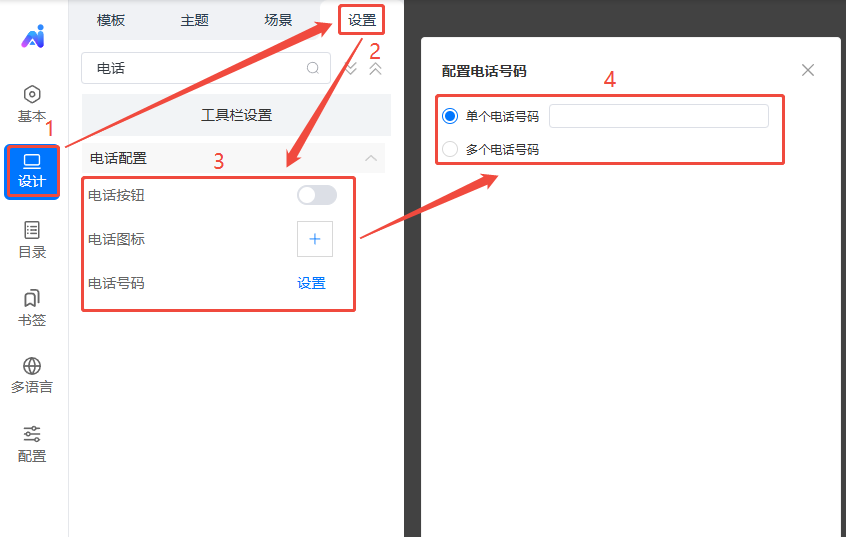 點擊【設計】,然后點擊【設置】,打開【電話按鈕】,有需要可以自定義【電話圖標】,輸入單個電話號碼或者多個電話號碼。