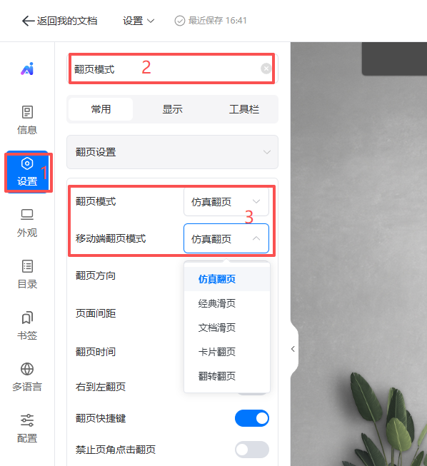 ①點(diǎn)擊【設(shè)置】,輸入“翻頁(yè)模式”關(guān)鍵字查詢,選擇仿真翻頁(yè)